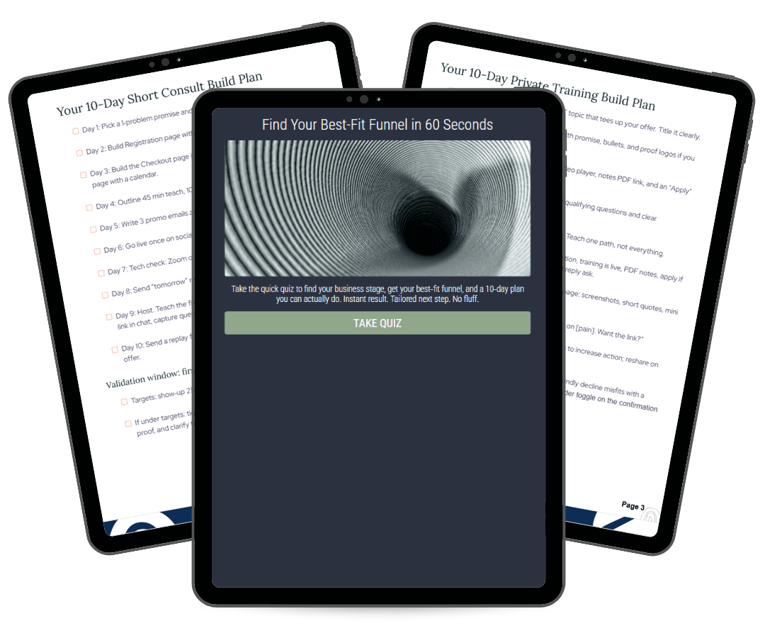 Take the quick quiz to pinpoint your business stage, get your best‑fit funnel, and a 10‑day plan you can actually finish. Instant result. Tailored next step. No fluff.